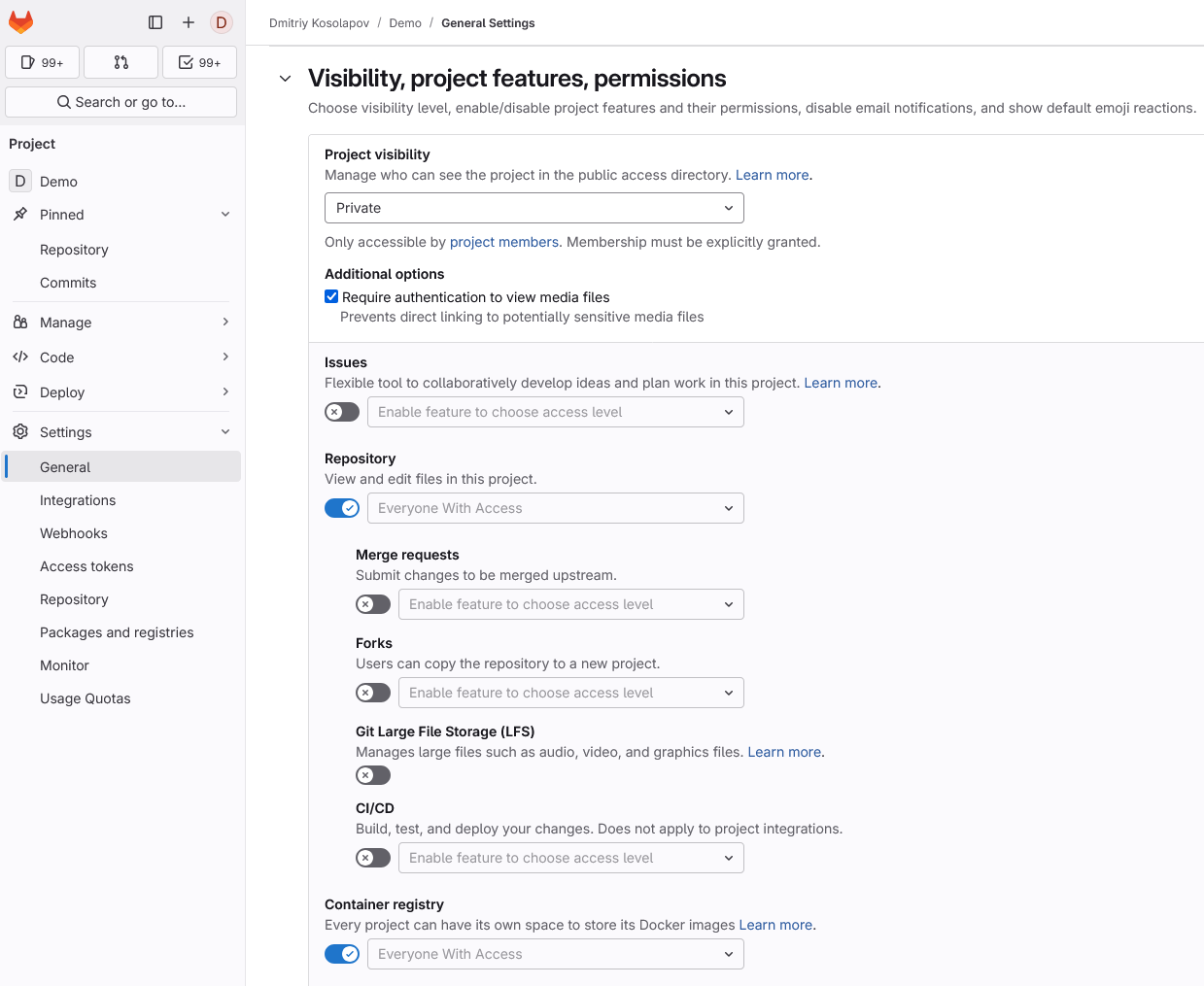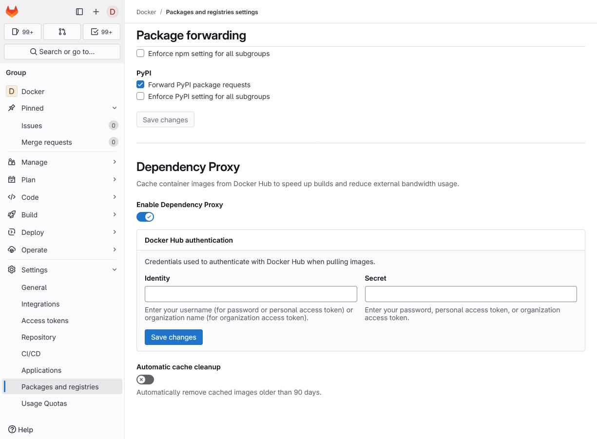 Оно же Dependency proxy for container images. Иными словами, GitLab может кэшировать образы с docker.io. По умолчанию включено, но работает анонимно. Если есть аккаунт в Docker Hub, то целесообразно его задействовать – будет меньше ограничений на загрузку. Возможный недостаток в том, что работает это все на уровне групп.