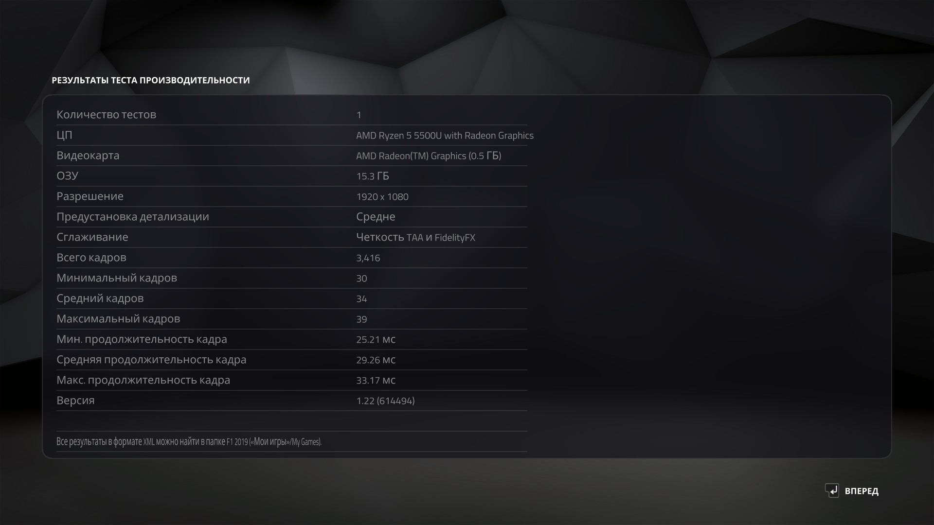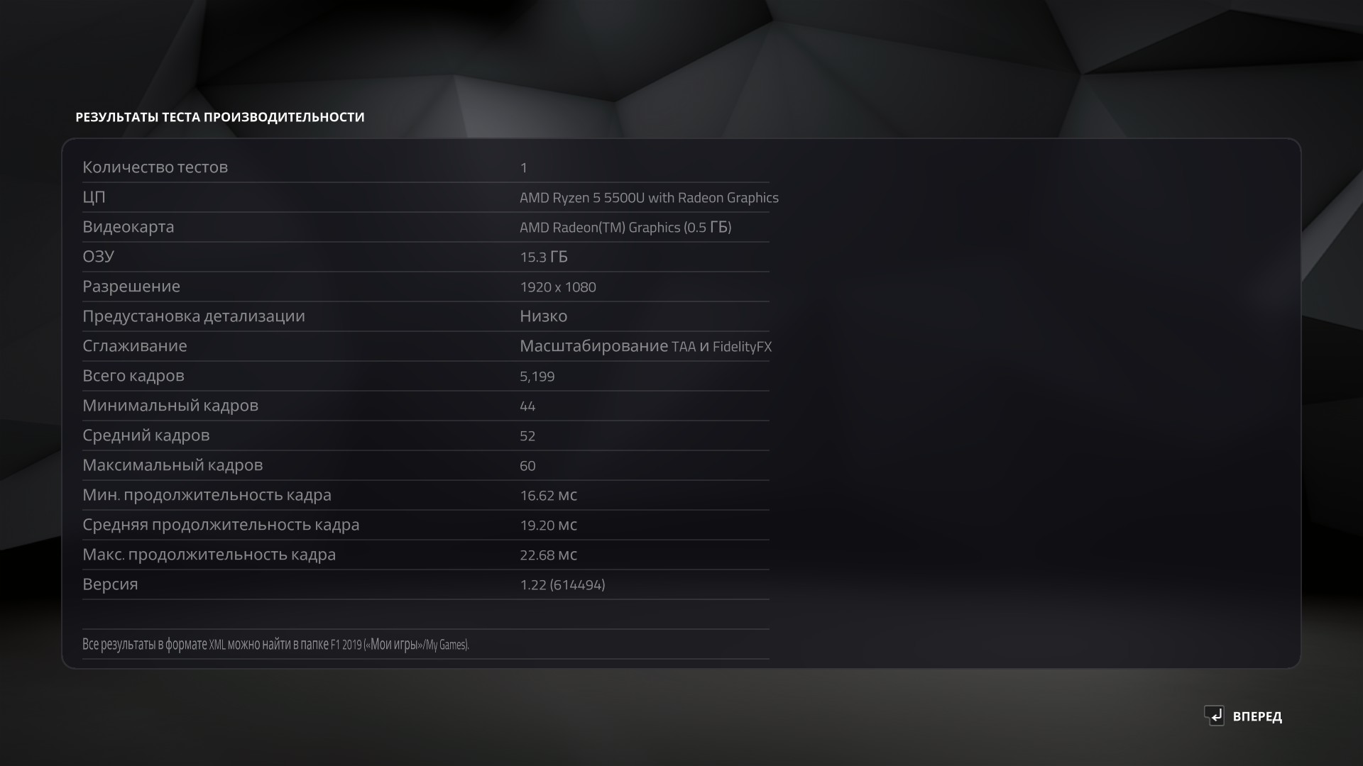 Я попытался экспериментировать с настройками, чтобы получить стабильные 60 FPS, но на FullHD все равно этого не удалось: лучший результат – 52 средних при минимуме 44 (при аналогичных настройках на 8 гигах было 29 min 24, в обзор вариант с FidelityFX не стал включать). Однако если ориентироваться на 30 кадров (хотя для гонок этого наверное маловато), то можно включить среднюю детализацию и «Четкость TAA».