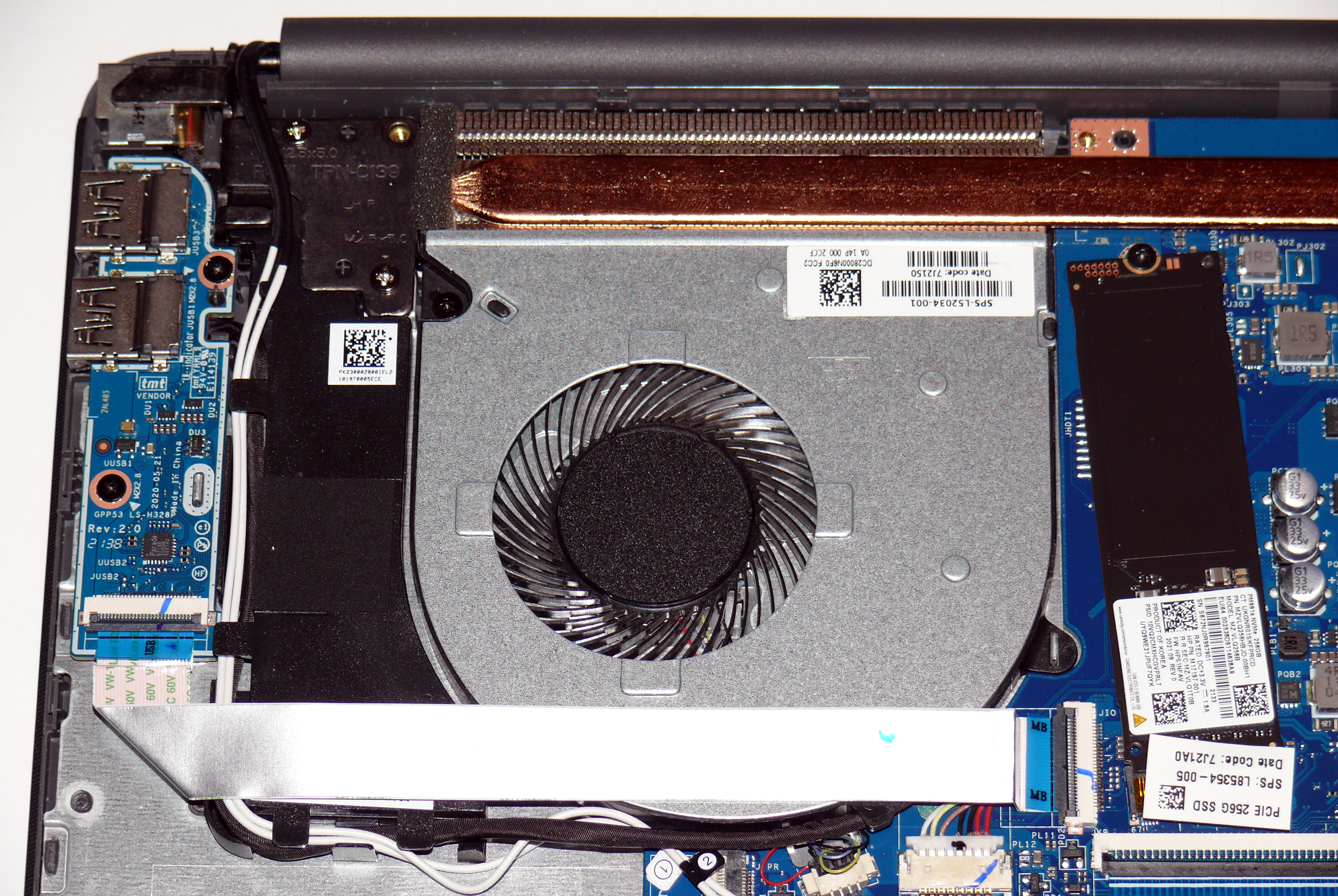 Бросаются в глаза аккумулятор (литий-полимерный HP HW03XL на 41 Вт*ч) и вентилятор. Отвод тепла от процессора осуществляется одной тепловой трубкой (довольно широкой впрочем). Нагретый воздух выводится формально на петлю, а по сути на экран. Слева внизу (на фото) вроде как есть место для установки накопителя 2,5", но чем и куда его подключать и каким образом закреплять, непонятно.