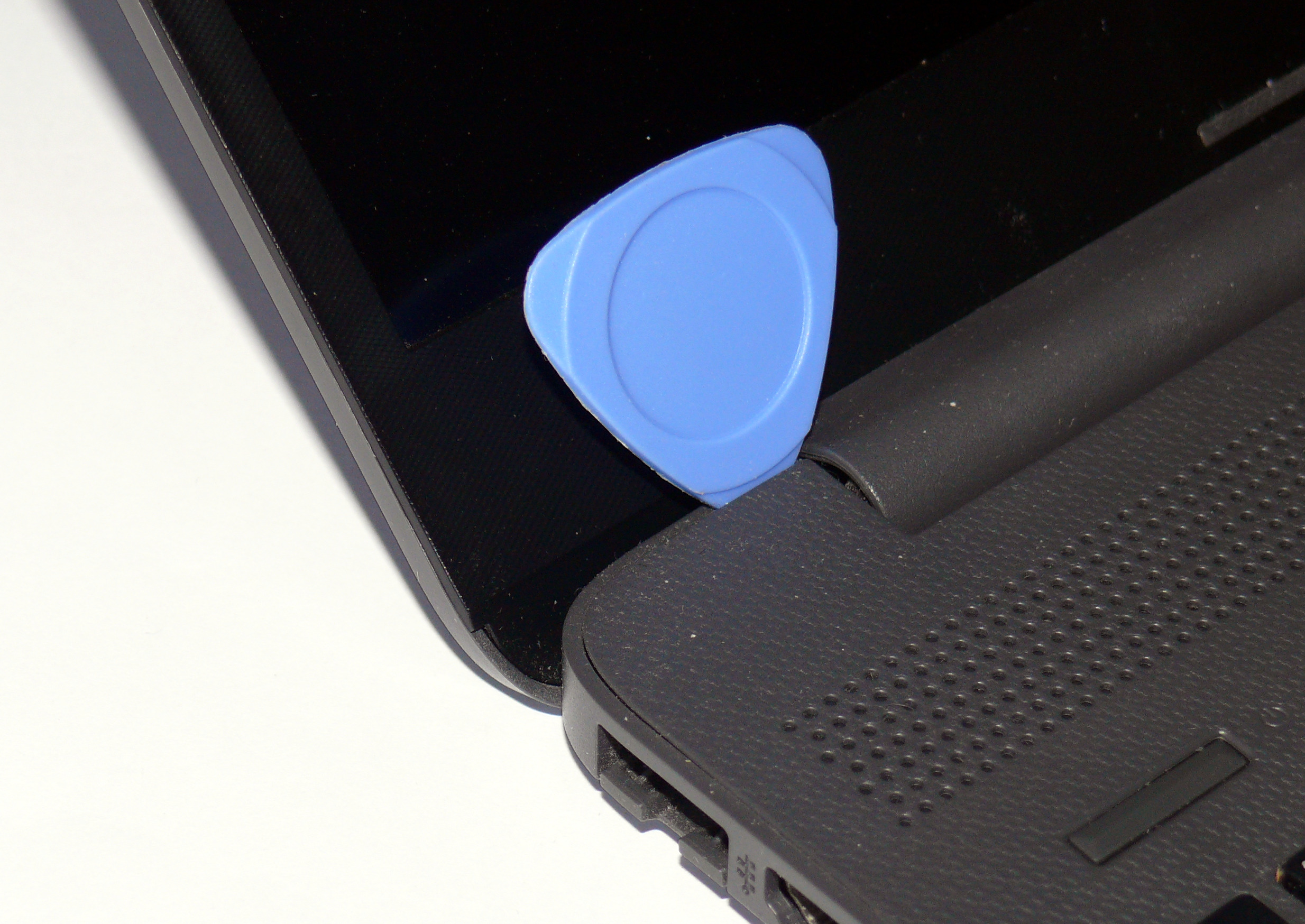 А далее медиатором отделяем крышку, для этого его надо умудриться сначала вставить в зазор между этой самой крышкой и верхней панелью ноутбука. Вероятно проще всего это сделать в районе петель и дальше уже соответственно вести по- или против часовой стрелки.